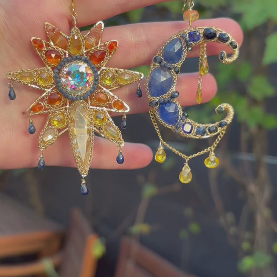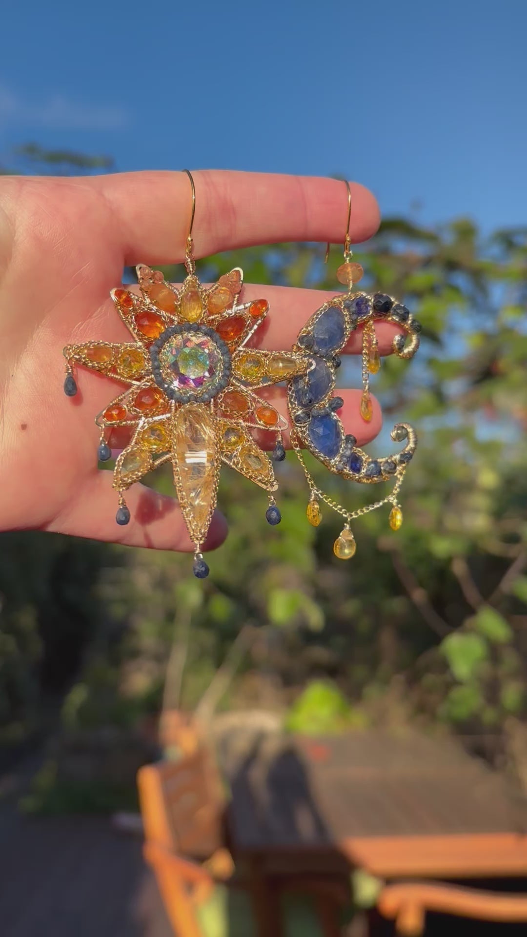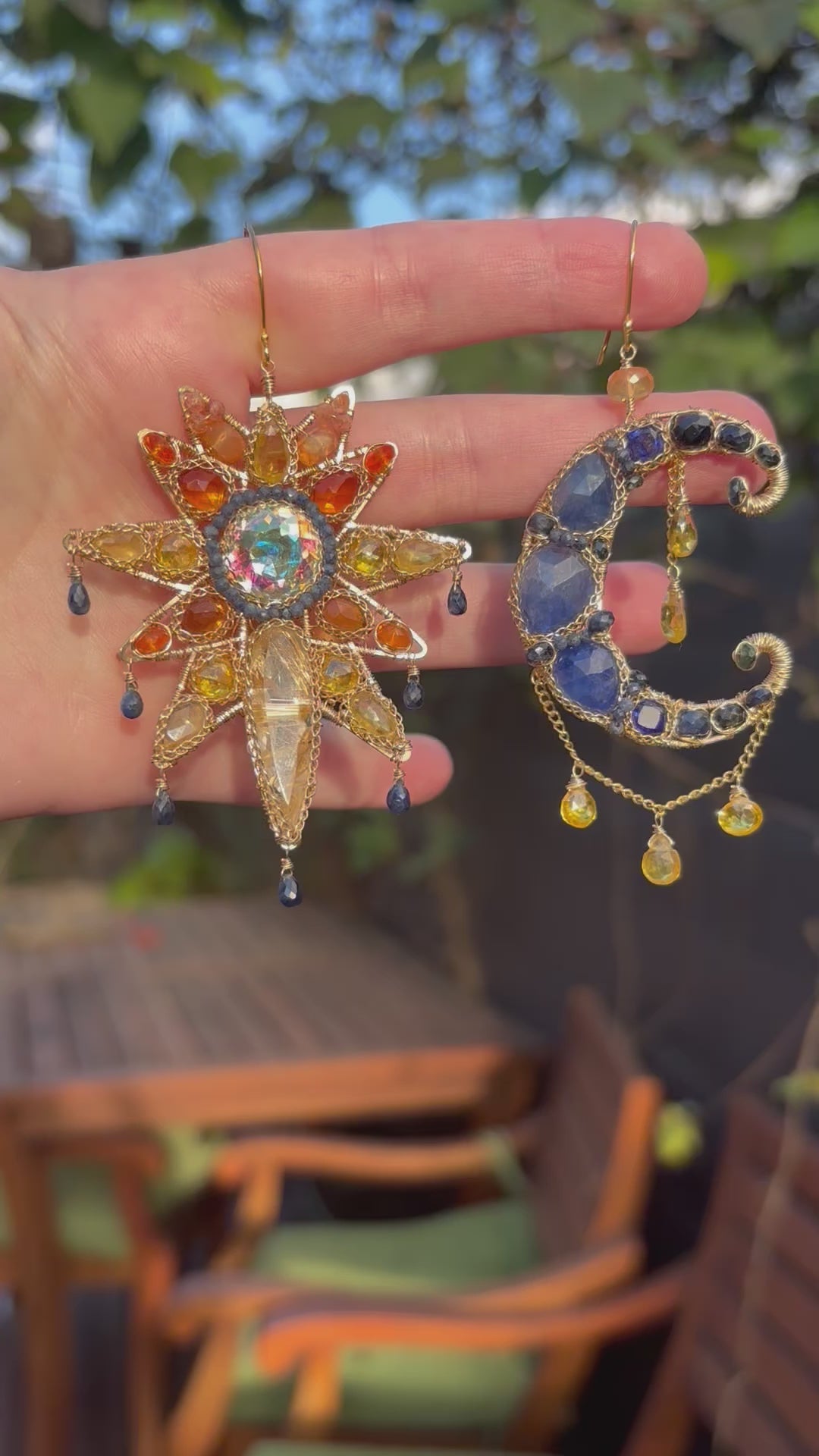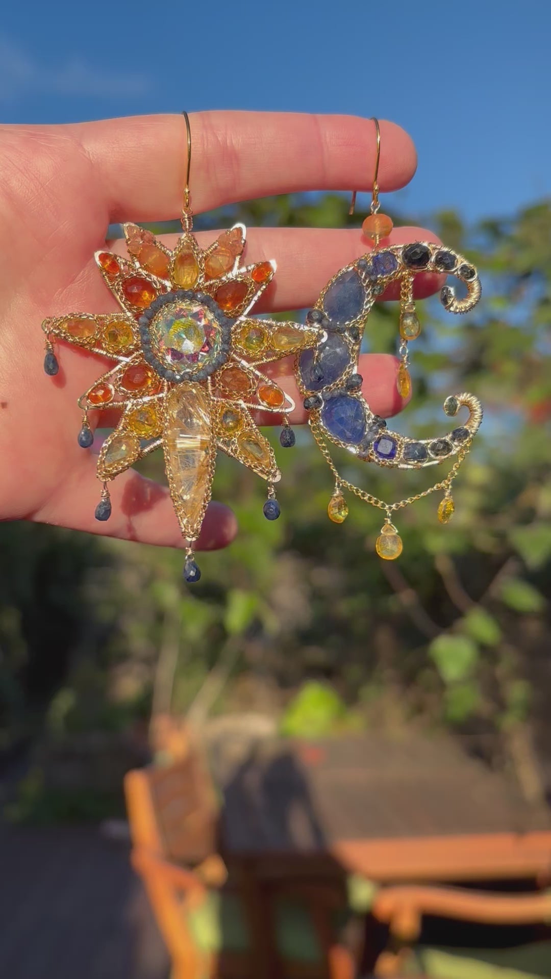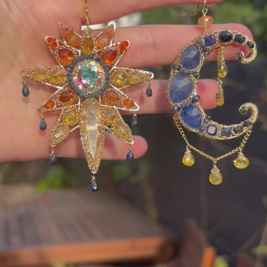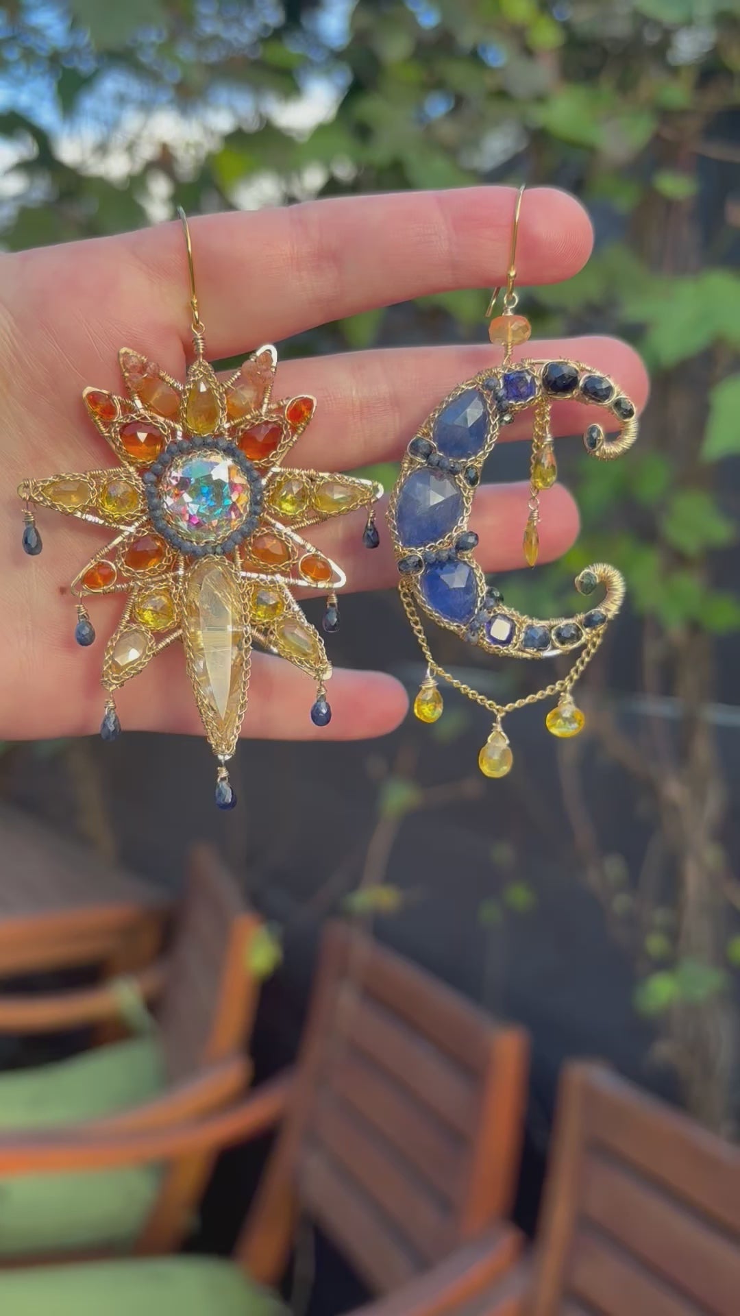 These blue and yellow sun and moon earrings have all the glitz, glamour, yet funkiness of the classic aesthetic. The sun, which can also double as a star, has a Swarovski crystal center full of rainbows and glitter surrounded by yellow sapphire, yellow cz, citrine and fire opal, with accents and drops of blue sapphire. The moon is all blue sapphire, with accents and drops of yellow sapphire and yellow cz! The balance of colors and whimsy of the celestial bodies gives me all the excitement it did in the 90s! Both earrings are all wrapped in 14k gold filled wire and chain.