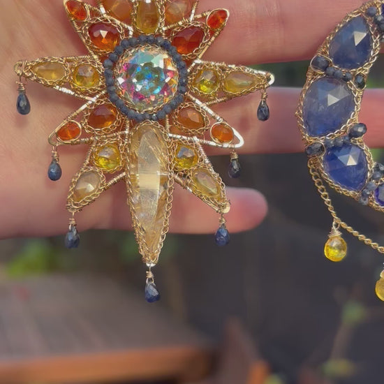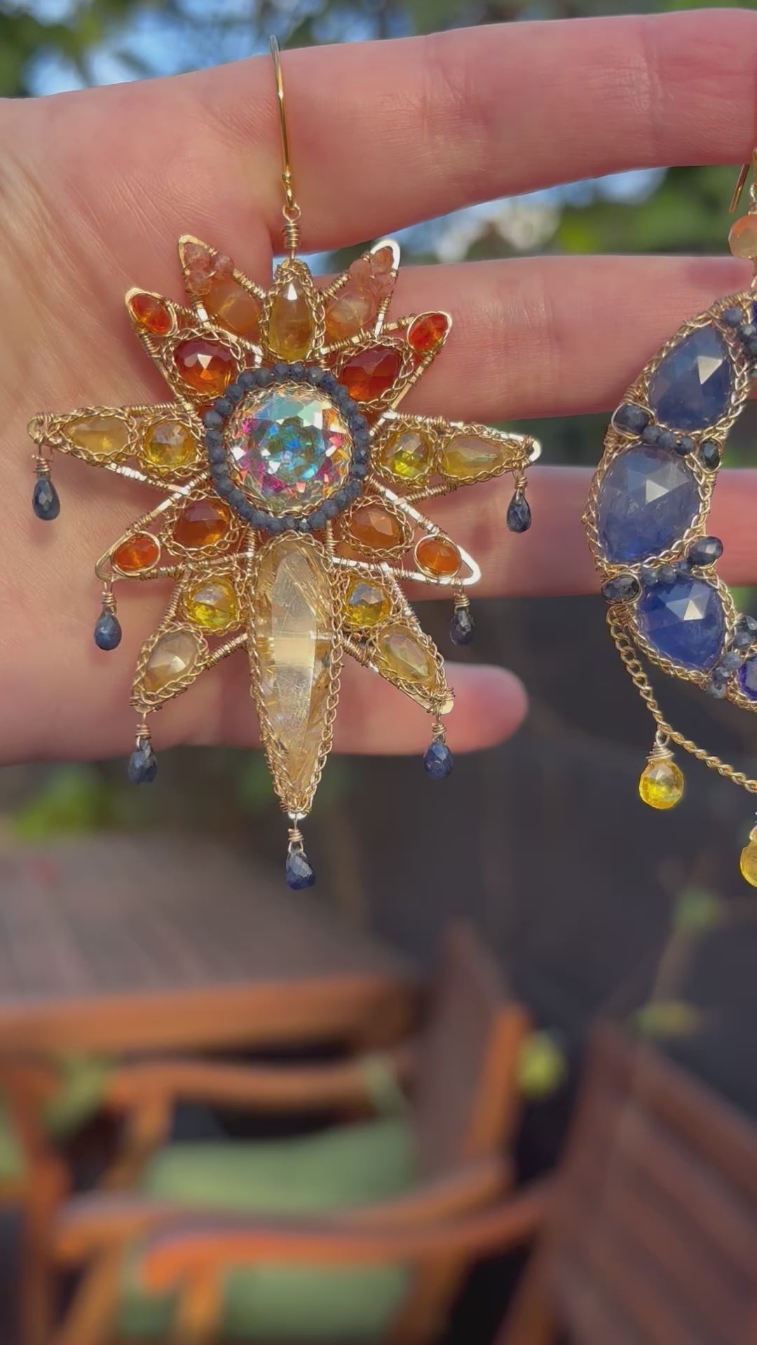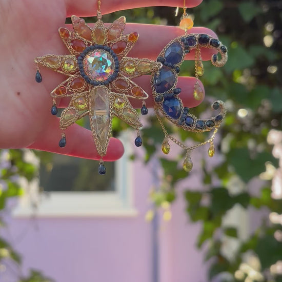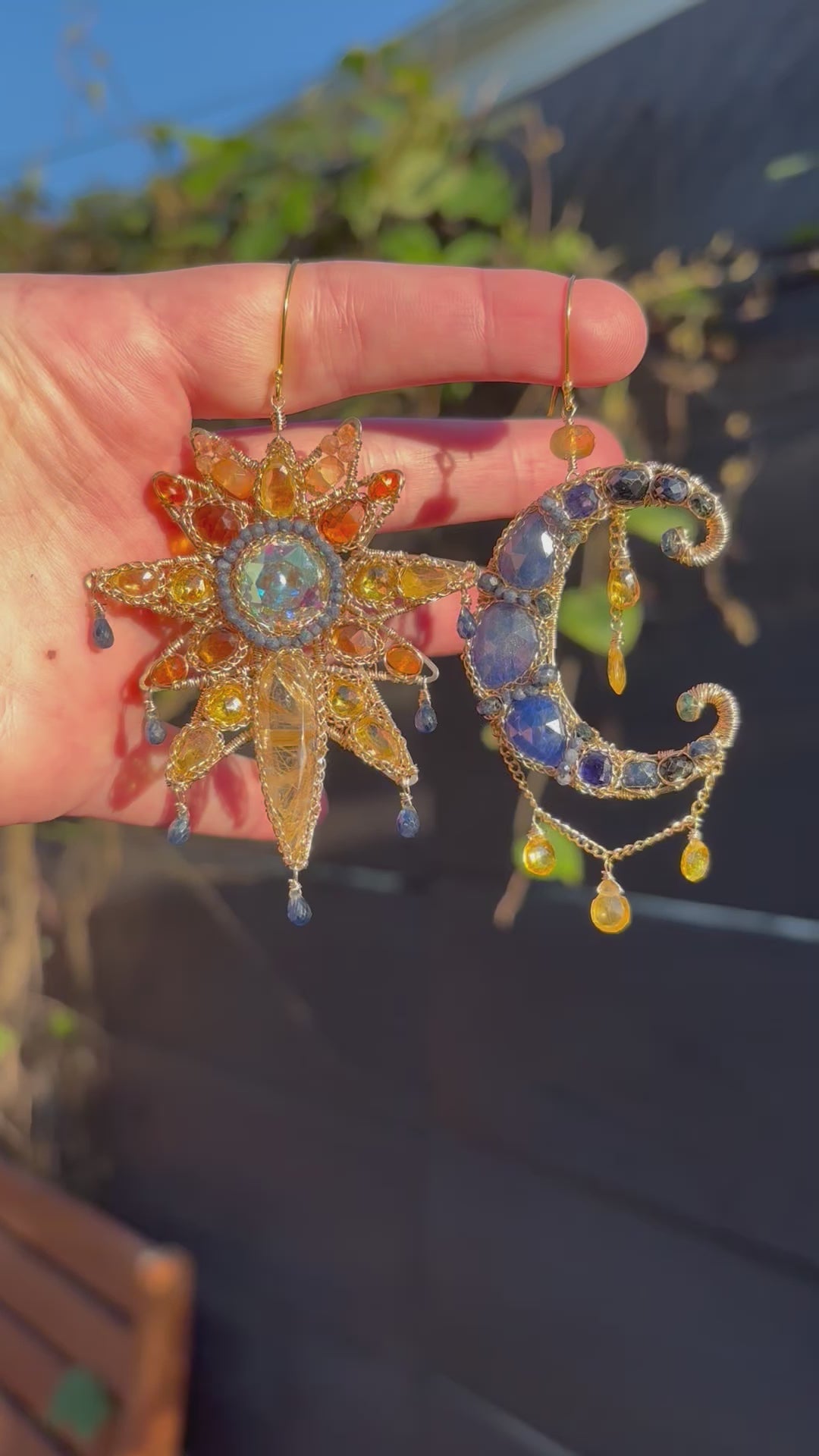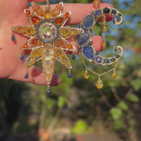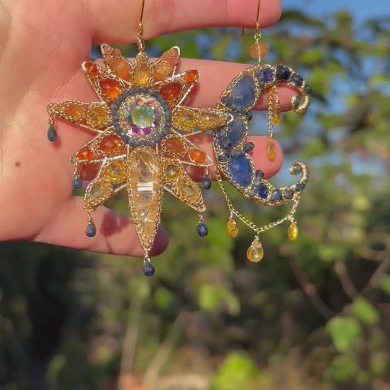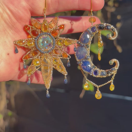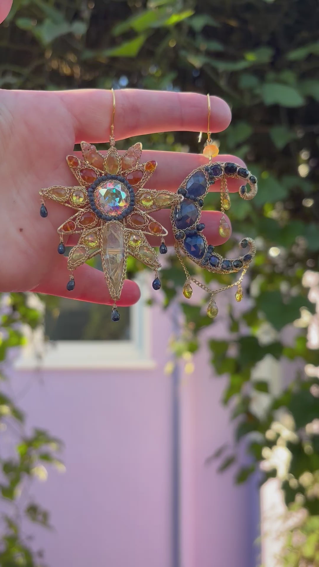 These blue and yellow sun and moon earrings have all the glitz, glamour, yet funkiness of the classic aesthetic. The sun, which can also double as a star, has a Swarovski crystal center full of rainbows and glitter surrounded by yellow sapphire, yellow cz, citrine and fire opal, with accents and drops of blue sapphire. The moon is all blue sapphire, with accents and drops of yellow sapphire and yellow cz! The balance of colors and whimsy of the celestial bodies gives me all the excitement it did in the 90s! Both earrings are all wrapped in 14k gold filled wire and chain.