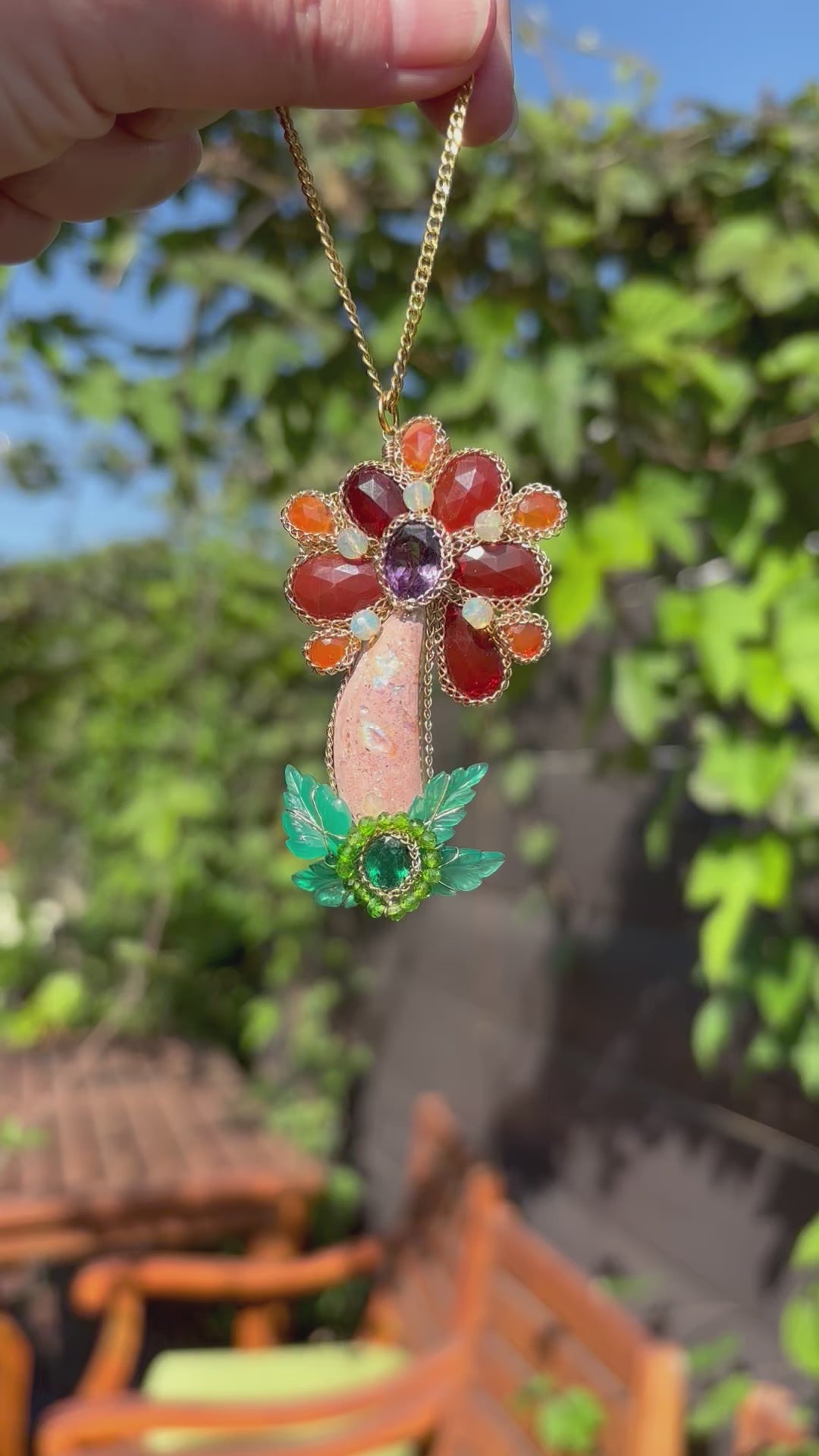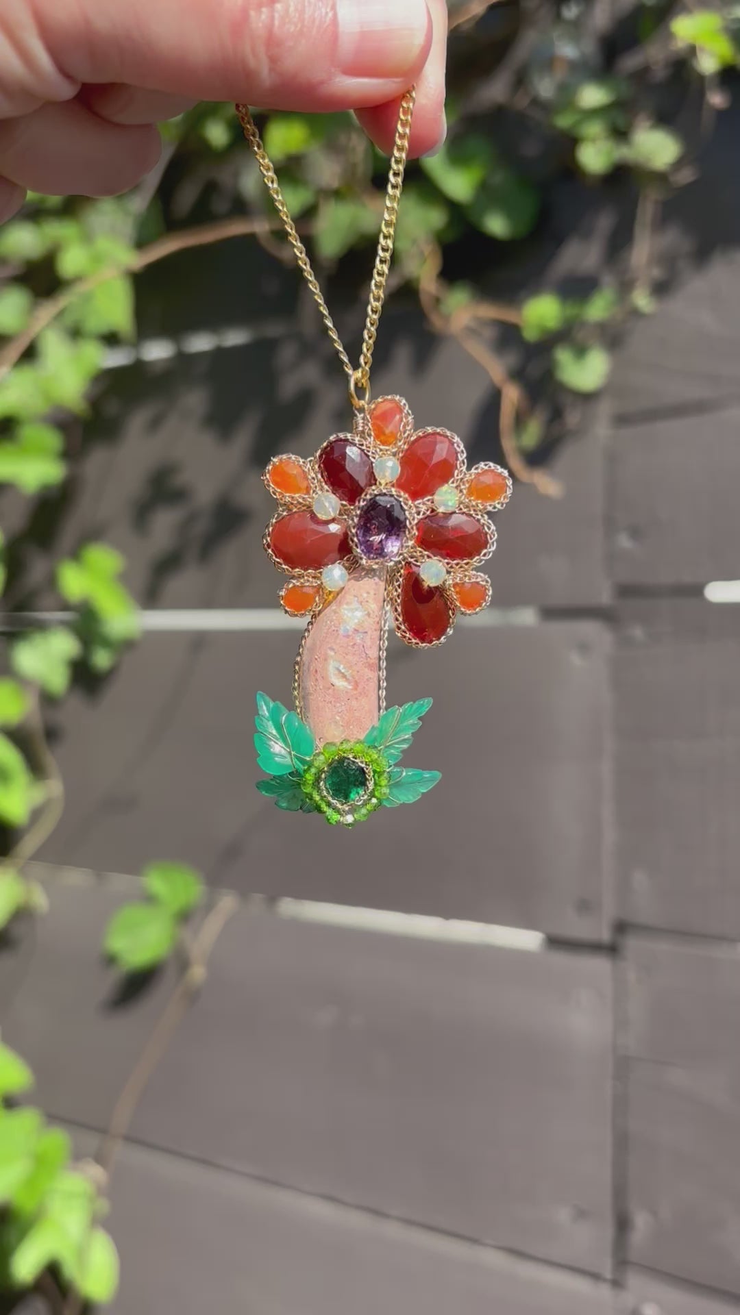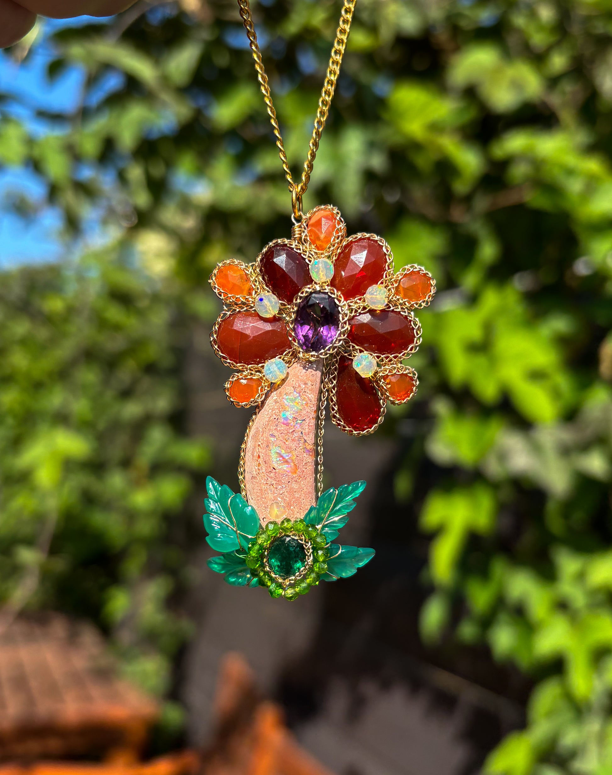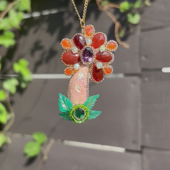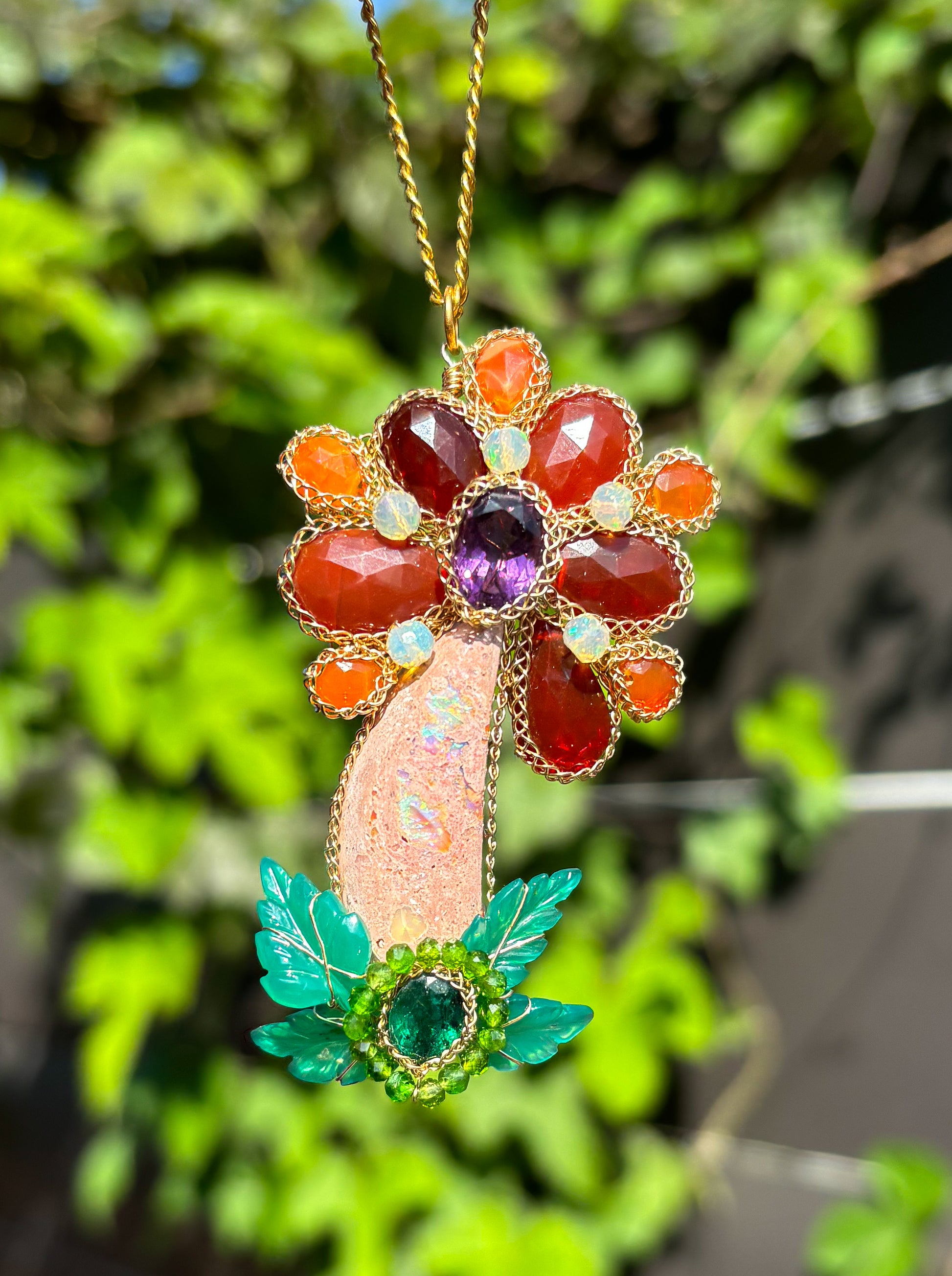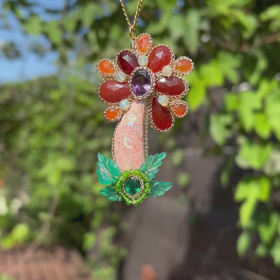A flower of fiery gemstone proportions! A fire opal stem with fire opal petals with a faceted amethyst center, with carved green chalcedony leaves, chrome diopside, and a gorgeous emerald. All flowers in full bloom for summer!