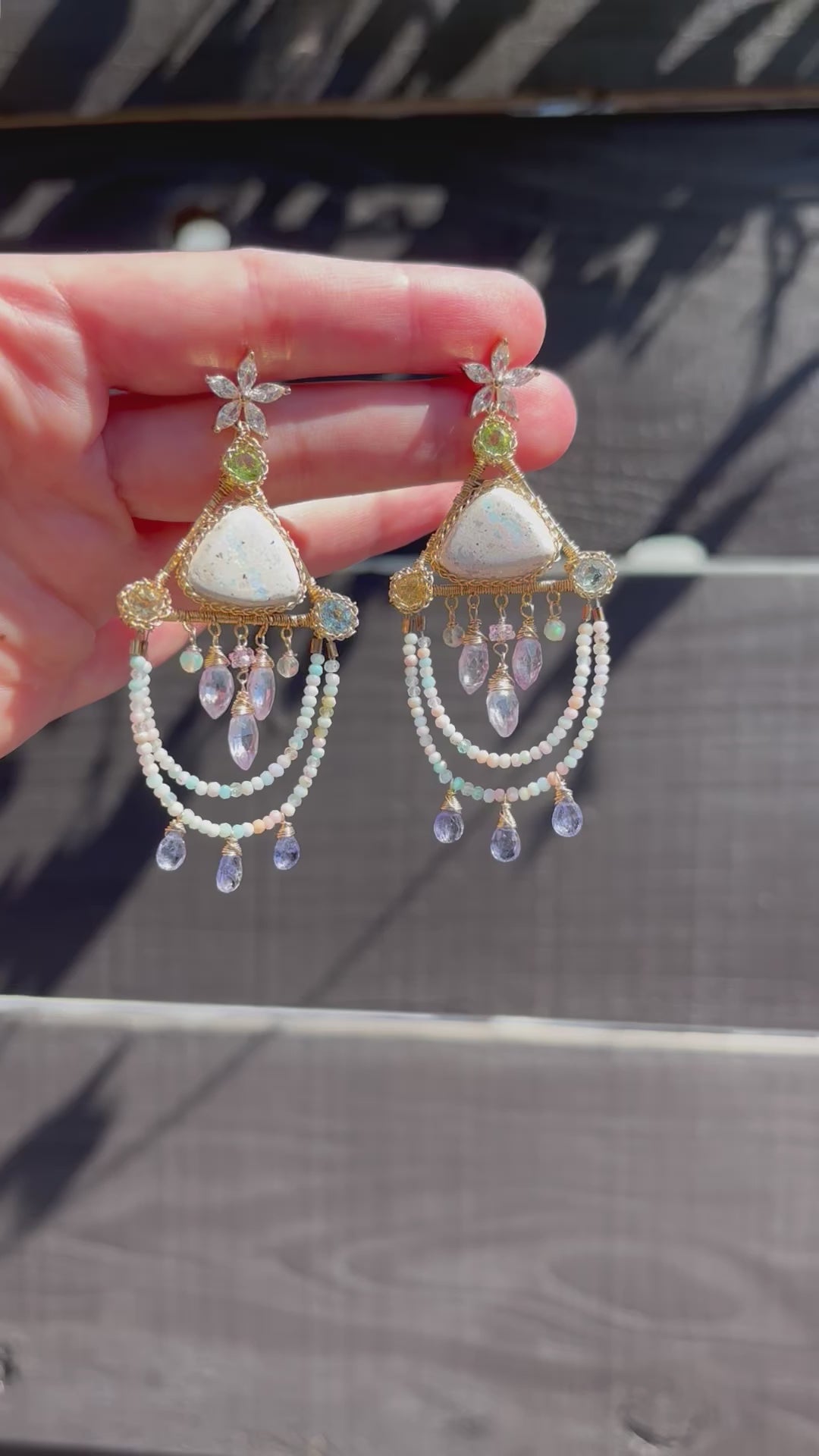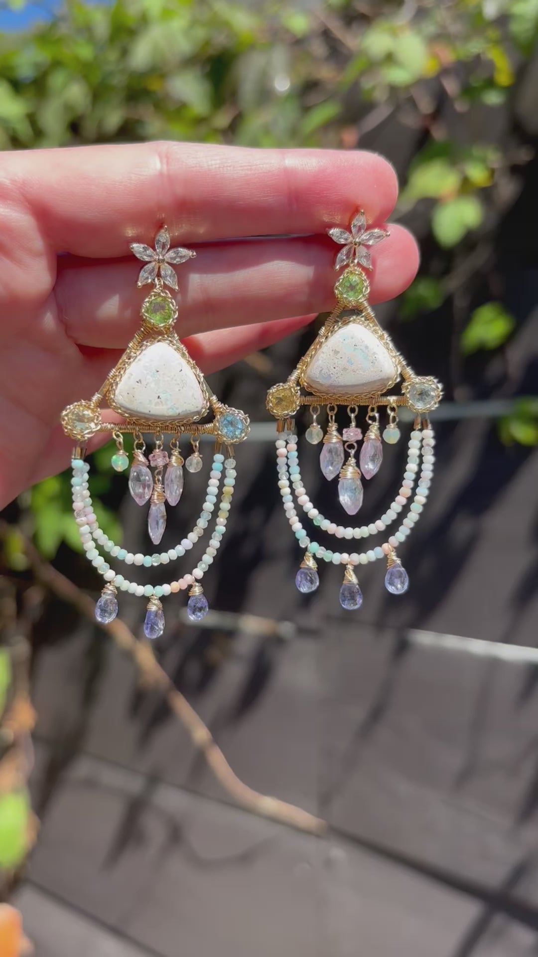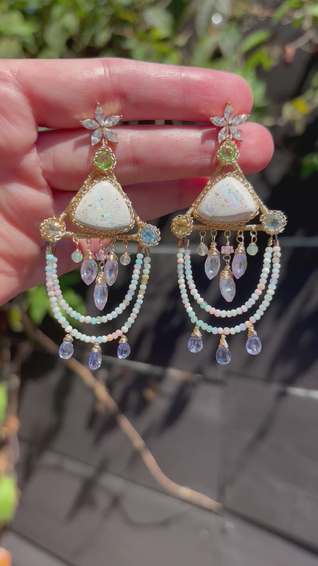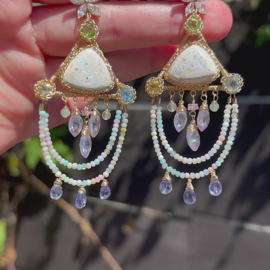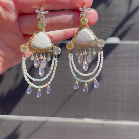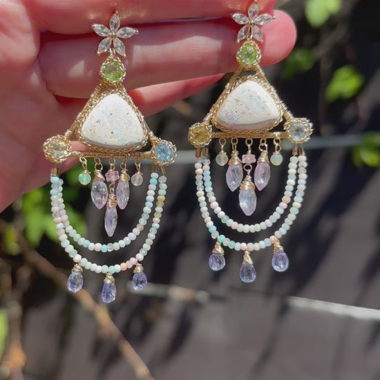 A pair of pastel, icy, and iridescent cantera fire opals set in triangles with peridot, sky blue topaz, and citrine faceted rounds in the corners. Candy colored tiny opals dangle with tanzanite, and in the center hangs lavender quartz marquis, opals and sapphire. The perfect pastels for the brightness and joy of summer!