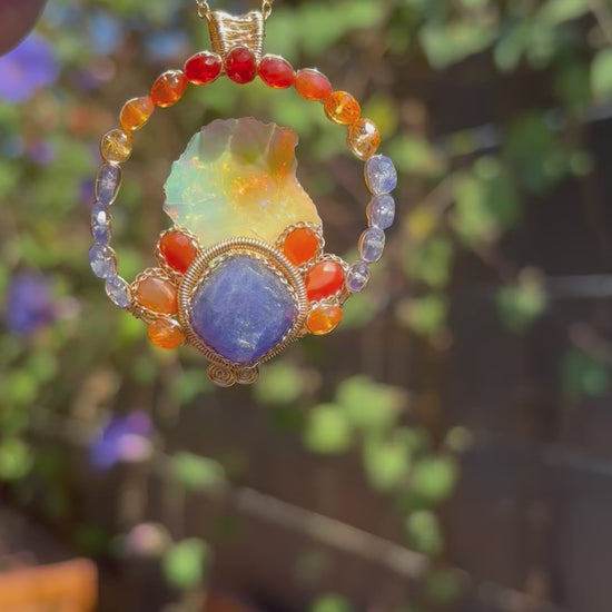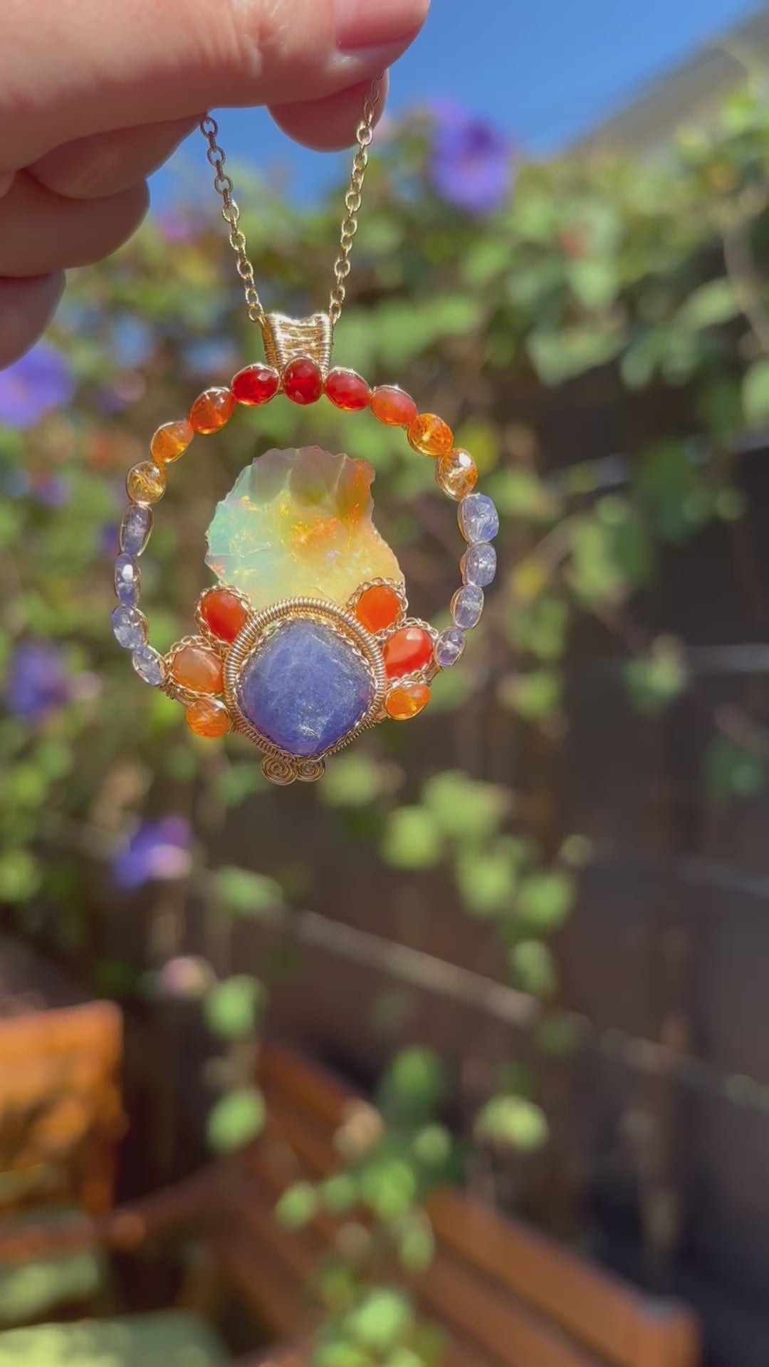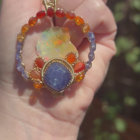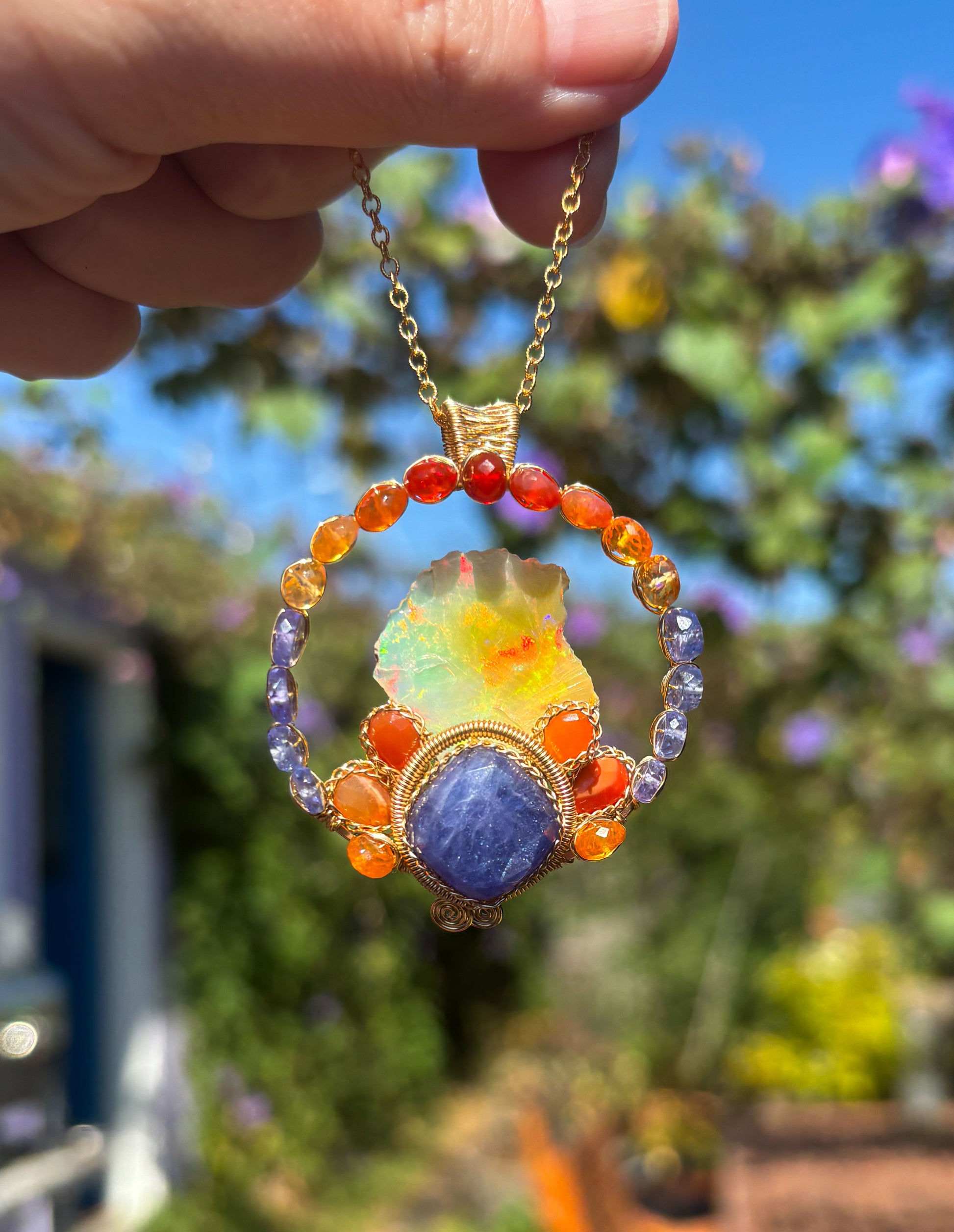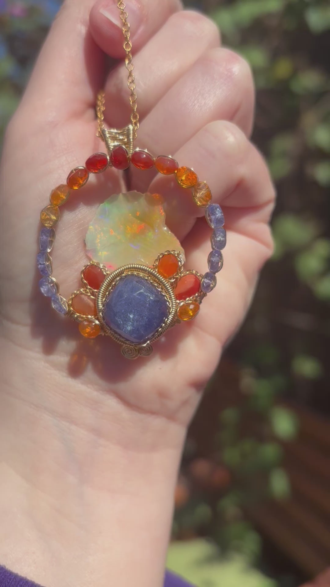 A stunning raw welo opal surrounded by tanzanite and different shades of fire opal! One of my favorite color combinations. All in 14k gold filled wire