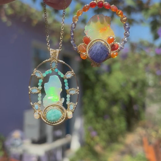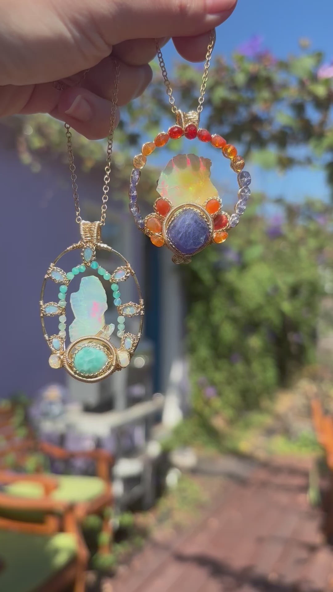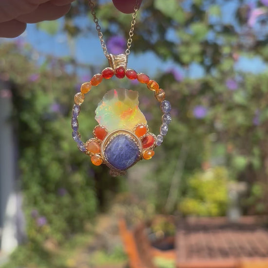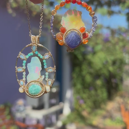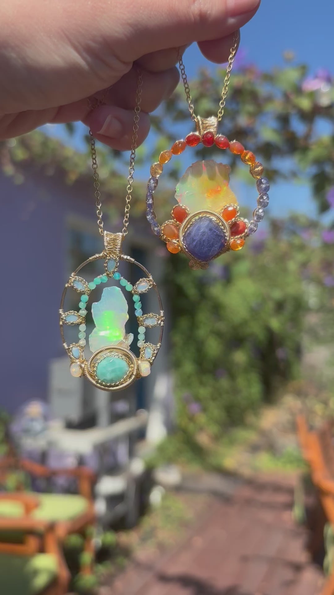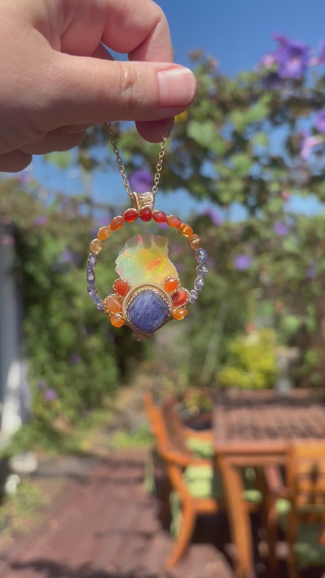 A stunning raw welo opal surrounded by tanzanite and different shades of fire opal! One of my favorite color combinations. All in 14k gold filled wire