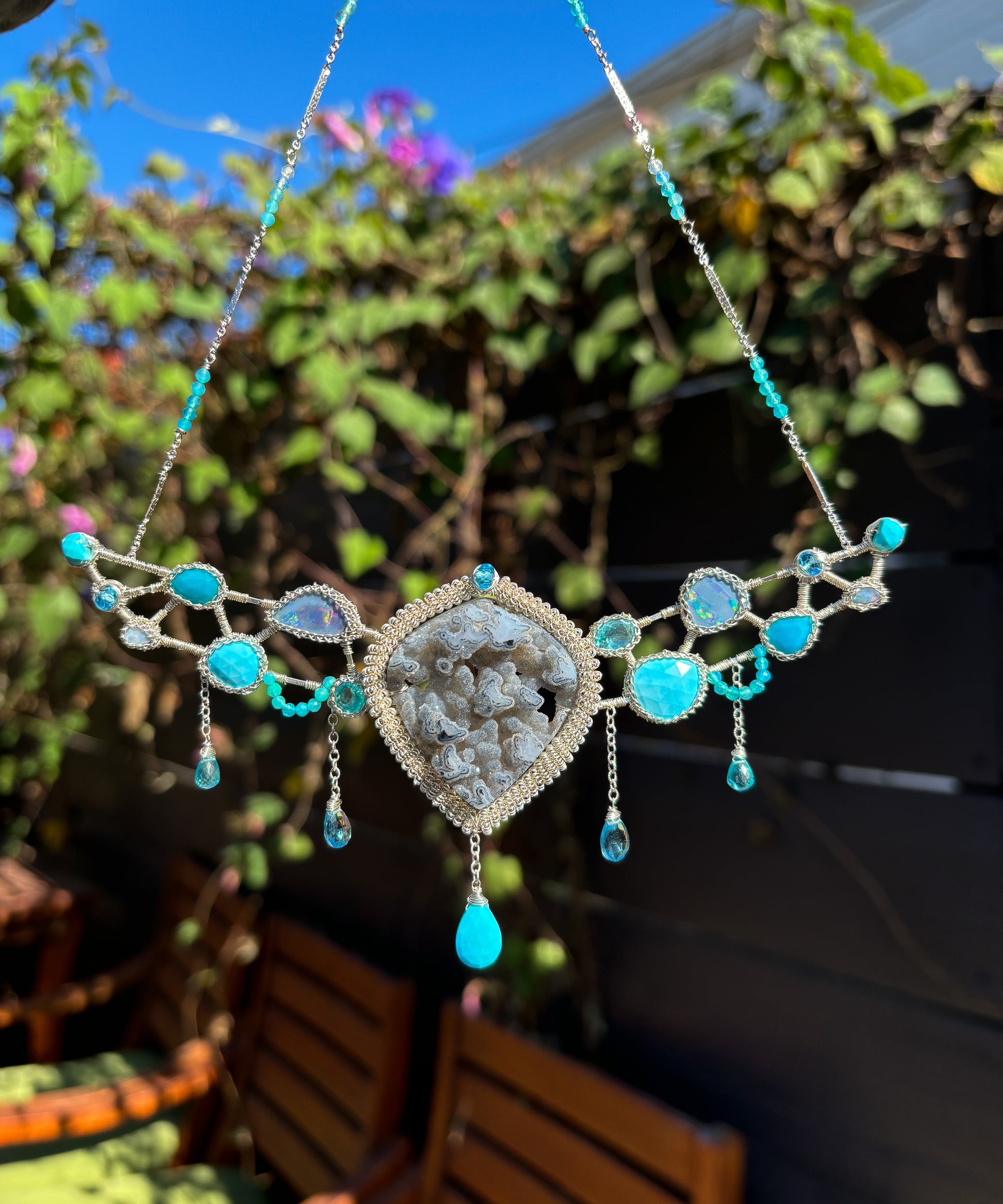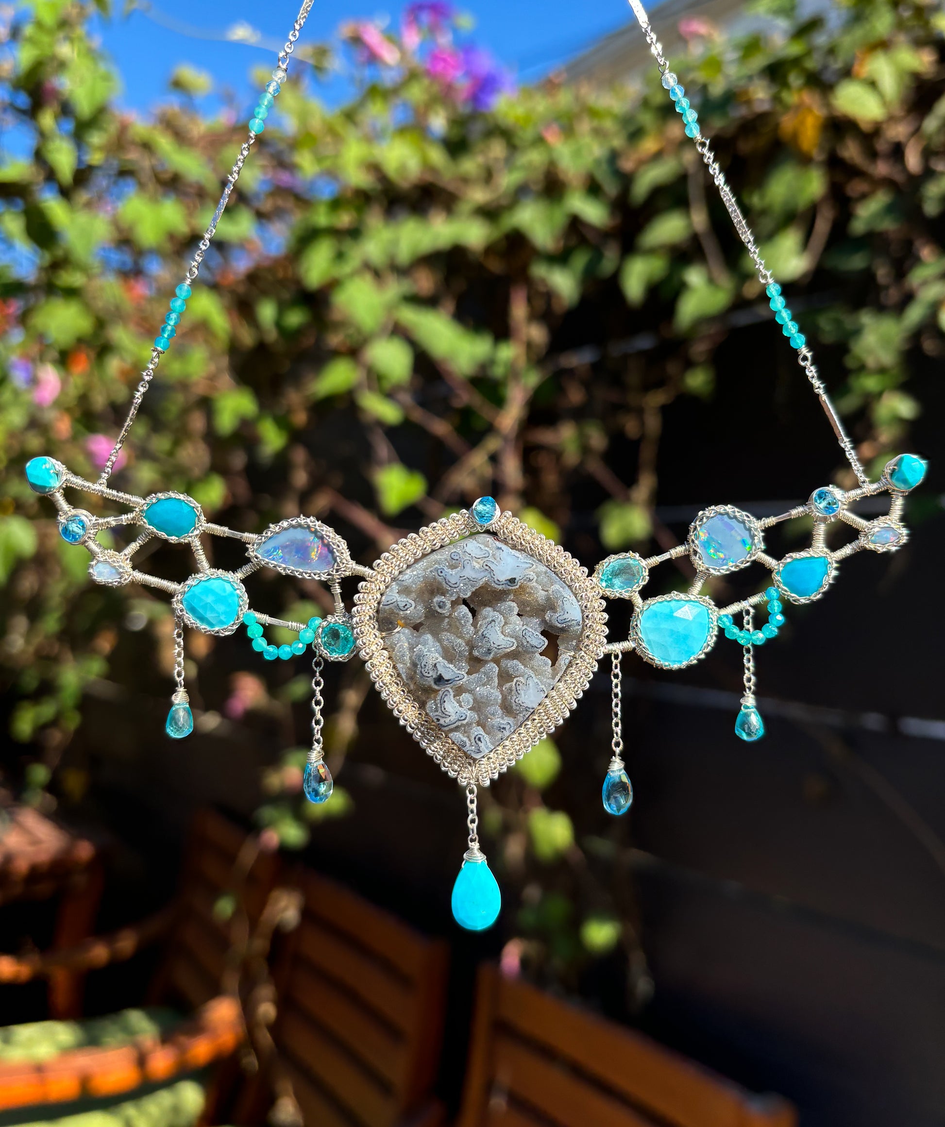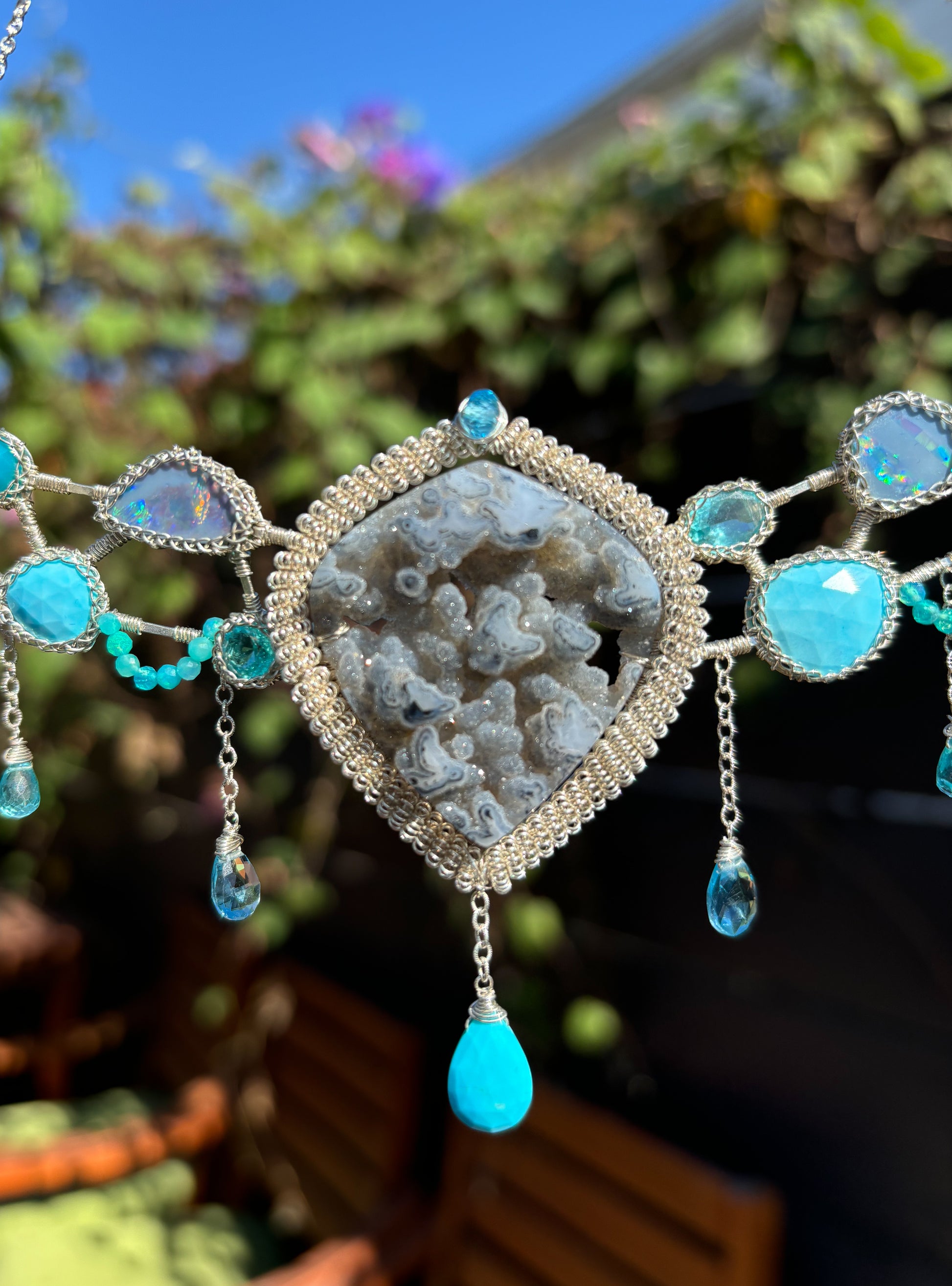 I picked up this absolutely jaw dropping piece of chalcedony agate druzy in Tucson at the last gem show, but needed to wait for the perfect idea to place it. A geometric collar of sleeping beauty turquoise (multiple shades) rainbow opal doublet; Swiss blue topaz, and apatite. All in sterling silver wire, with a sterling silver and teal opal chain.