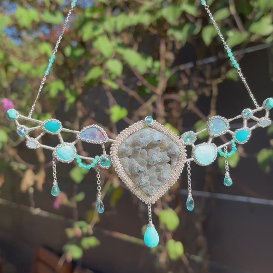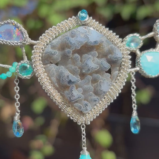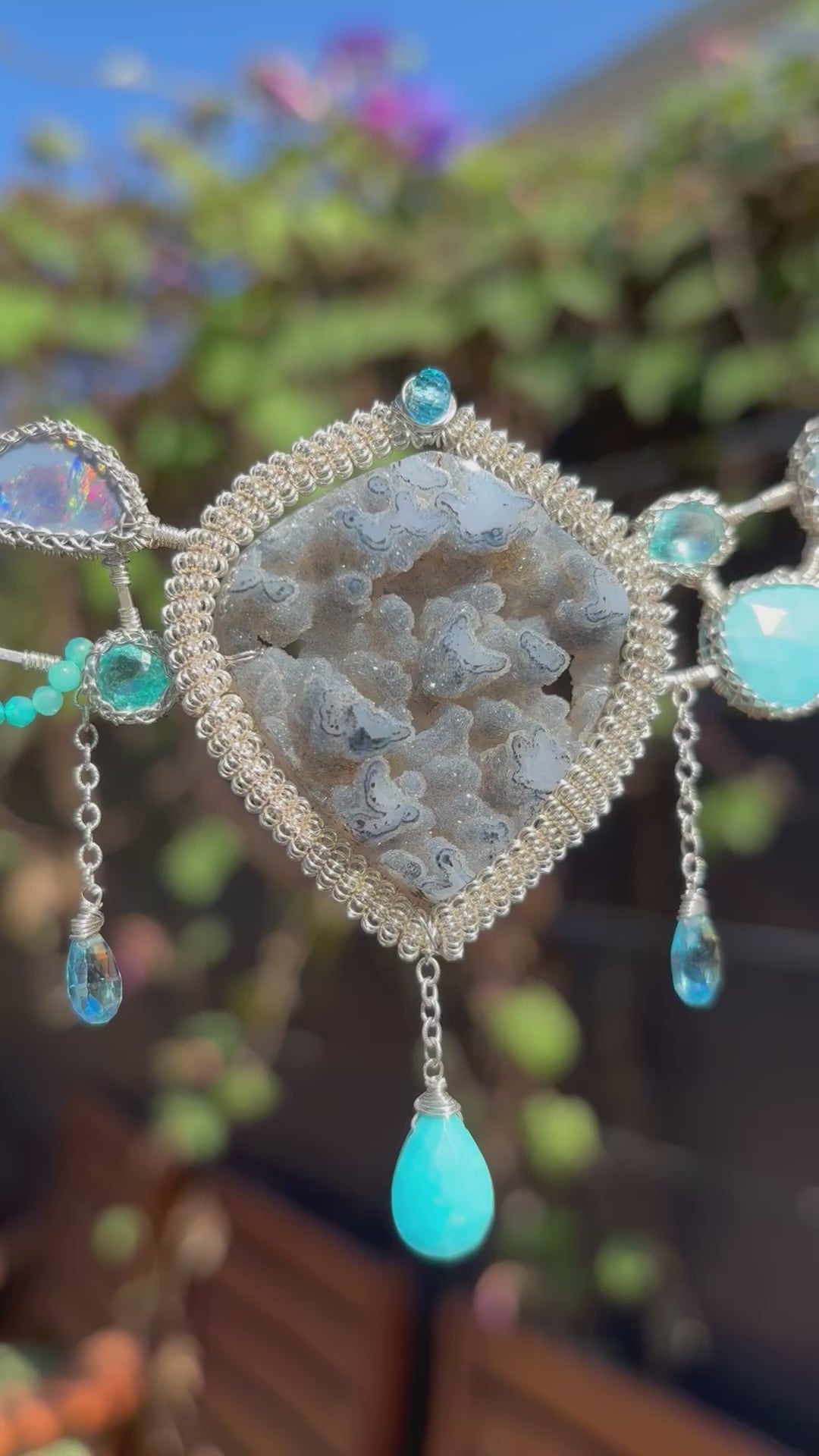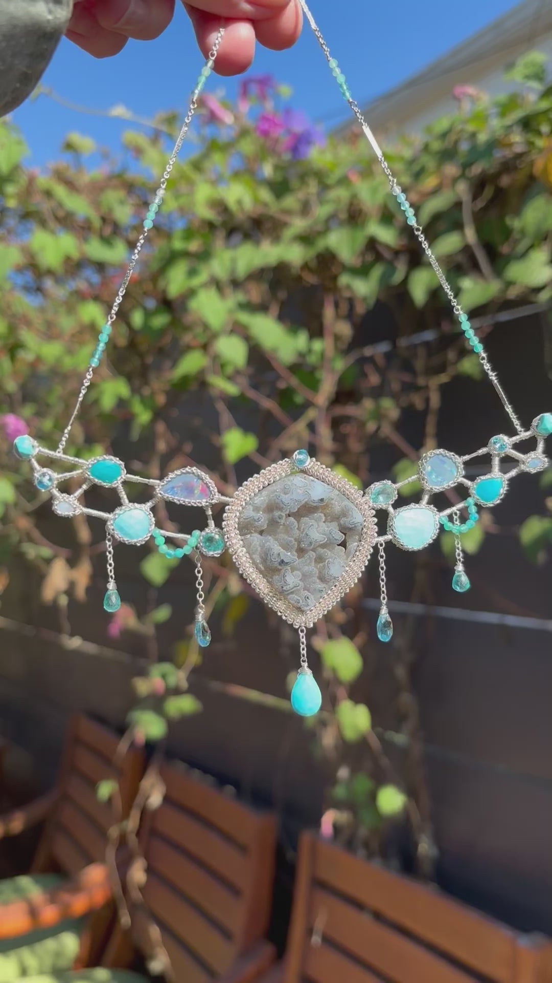 I picked up this absolutely jaw dropping piece of chalcedony agate druzy in Tucson at the last gem show, but needed to wait for the perfect idea to place it. A geometric collar of sleeping beauty turquoise (multiple shades) rainbow opal doublet; Swiss blue topaz, and apatite. All in sterling silver wire, with a sterling silver and teal opal chain.